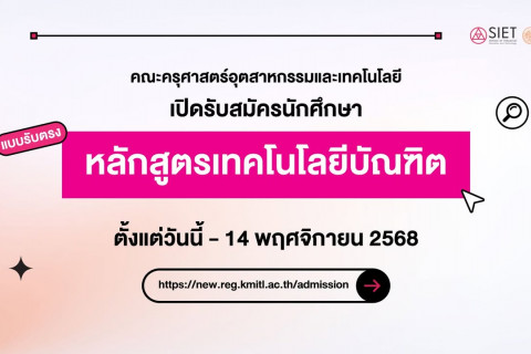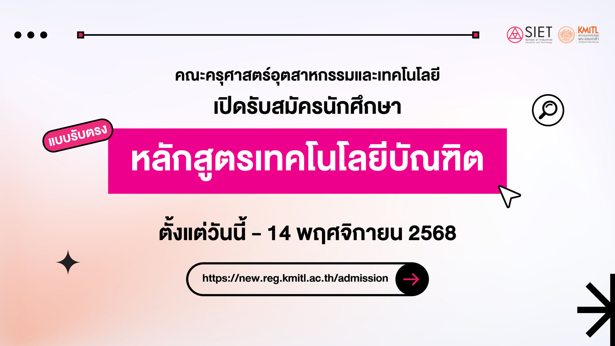 10 Apr ประกาศรายชื่อผู้มีสิทธิ์เข้าศึกษาระดับปริญญาตรี แบบรับตรง รอบที่ 2 หลักสูตรเทคโนโลยีบัณฑิต สาขาวิชาบูรณาการนวัตกรรมเพื่อสินค้าและบริการ (ต่อเนื่อง 2 ปี) คณะครุศาสตร์อุตสาหกรรมและเทคโนโลยี ประจำปีการศึกษา 2568
