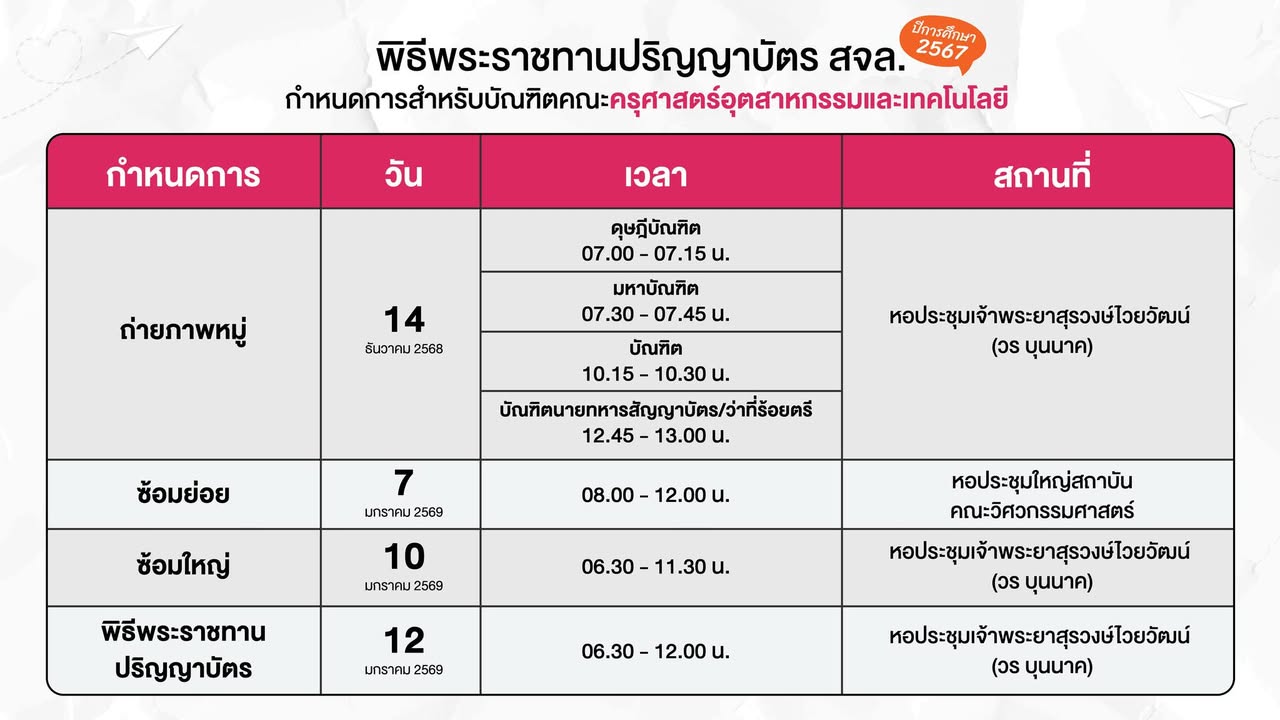 🩷 กำหนดการสำหรับบัณฑิตคณะครุศาสตร์อุตสาหกรรมและเทคโนโลยี