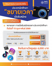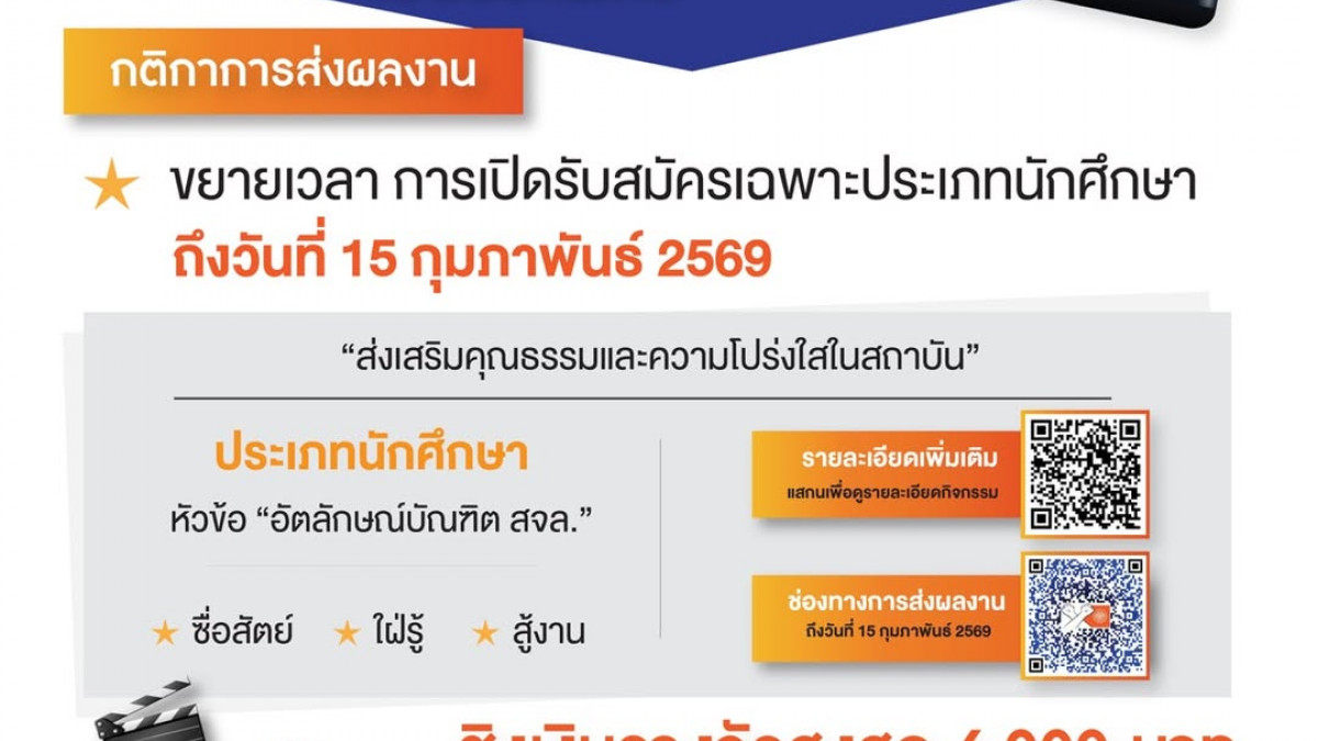 ขยายเวลาแล้ว! ถึงวันที่ 15 กุมภาพันธ์ 2569 ยังไม่สาย! สำหรับนักศึกษาห้ามพลาด โอกาสยังรอคนมีไอเดีย ส่งคลิปวันนี้ ลุ้นรางวัลใหญ่ 6,000 บาท! ไอเดียคุณมีค่า…ส่งประกวดเลย! ขยายเวลาเพิ่ม สำหรับนักศึกษาที่ยังไม่ทันส่ง