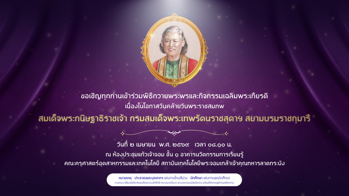 คณะครุศาสตร์อุตสาหกรรมและเทคโนโลยี สถาบันเทคโนโลยีพระจอมเกล้าเจ้าคุณทหารลาดกระบัง ขอเชิญทุกท่านเข้าร่วมพิธีถวายพระพรและกิจกรรมเฉลิมพระเกียรติ สมเด็จพระกนิษฐาธิราชเจ้า กรมสมเด็จพระเทพรัตนราชสุดาฯ สยามบรมราชกุมารี เนื่องในโอกาสวันคล้ายวันพระราชสมภพ