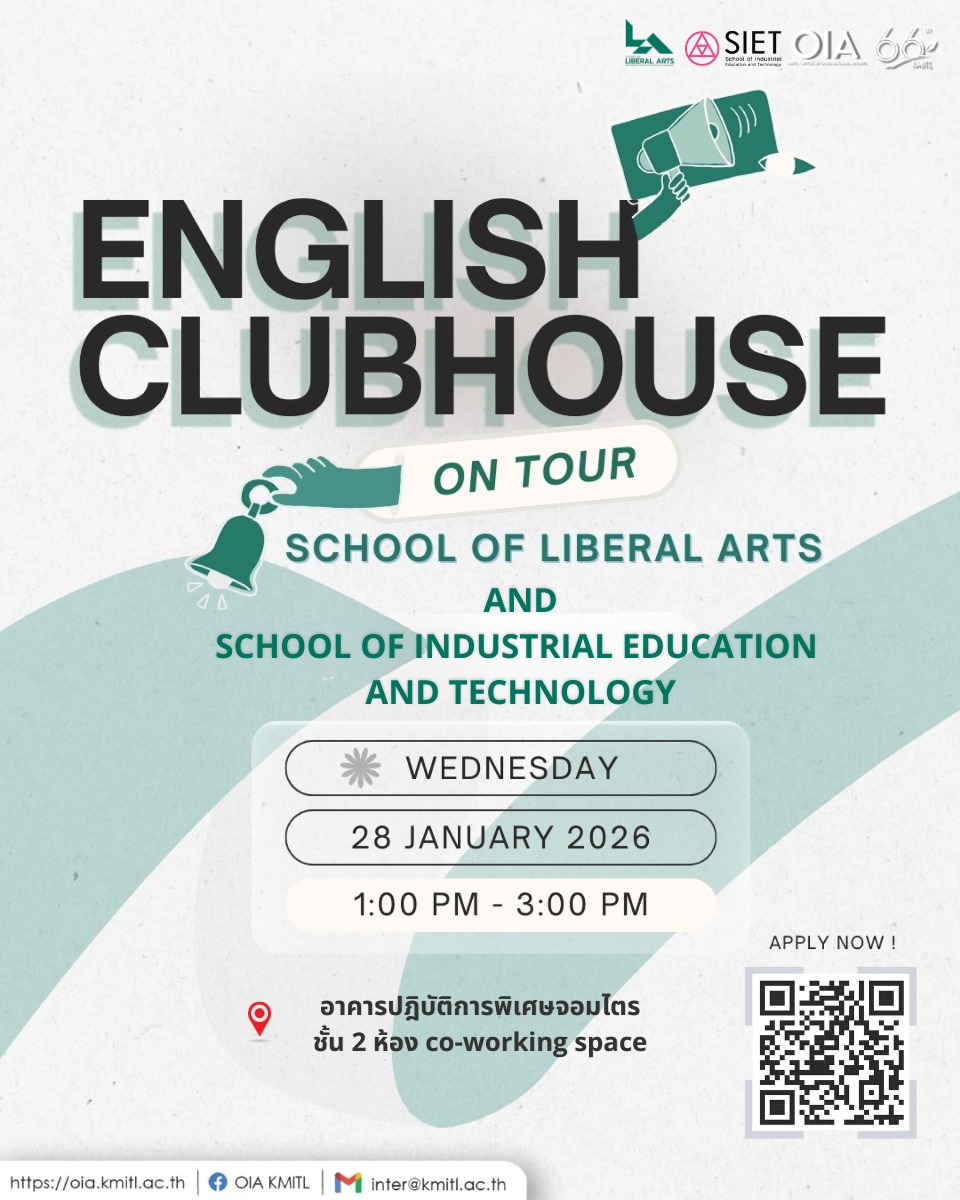 สำนักงานกิจการต่างประเทศ (OIA) ร่วมกับคณะศิลปศาสตร์ และคณะครุศาสตร์อุตสาหกรรมและเทคโนโลยี ขอเชิญชวนนักศึกษาที่สนใจพัฒนาทักษะภาษาอังกฤษ เข้าร่วมกิจกรรม English Clubhouse on Tour กิจกรรมสร้างสรรค์ที่เปิดโอกาสให้ฝึกการสื่อสารภาษาอังกฤษในบรรยากาศเป็นกันเอง สนุก และได้ใช้จริง