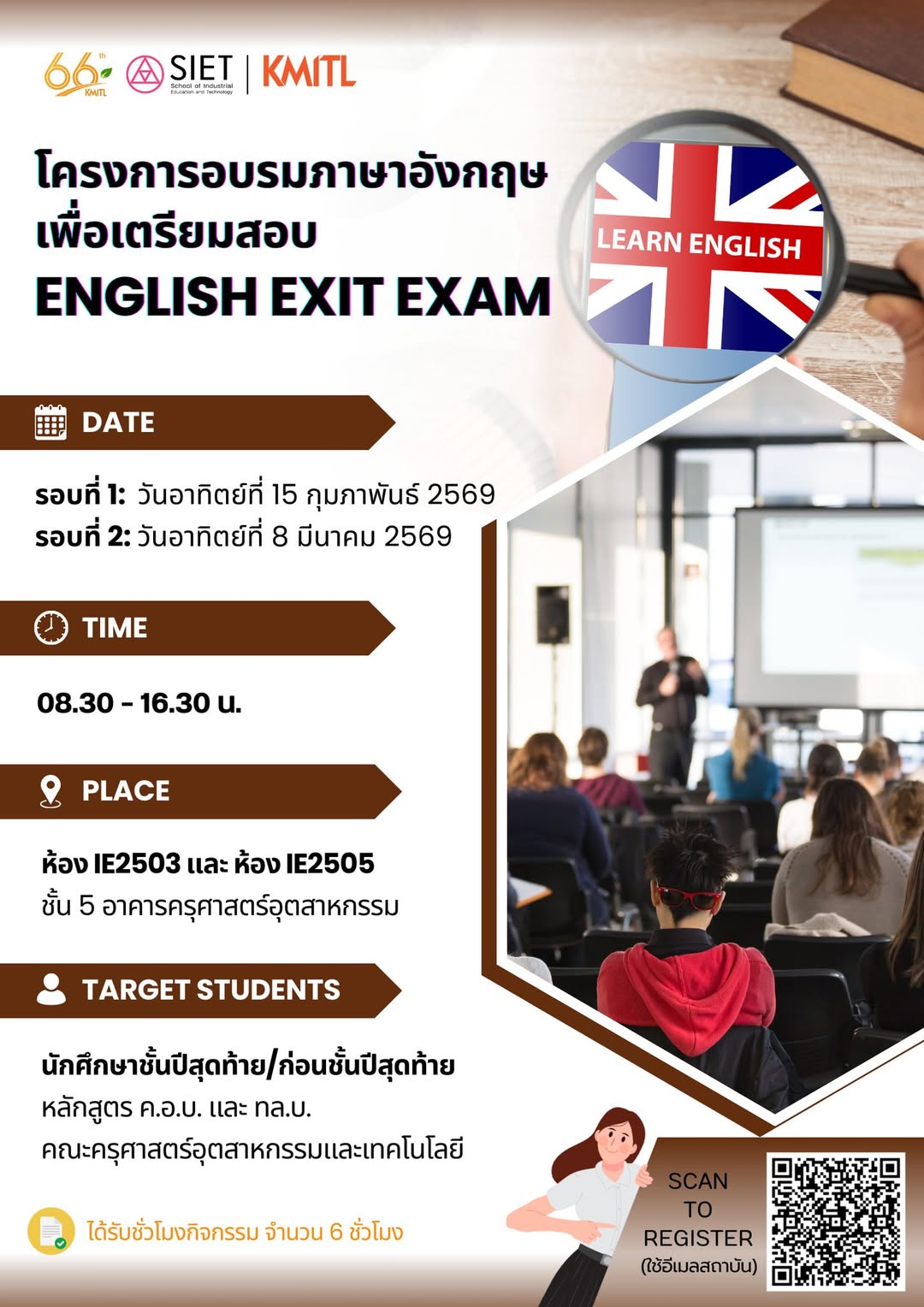 ขอเชิญนักศึกษาชั้นปีสุดท้าย/ก่อนชั้นปีสุดท้าย หลักสูตร ค.อ.บ. และ ทล.บ. คณะครุศาสตร์อุตสาหกรรมและเทคโนโลยี เข้าร่วมโครงการอบรมภาษาอังกฤษเพื่อเตรียมสอบ ENGLISH EXIT EXAM