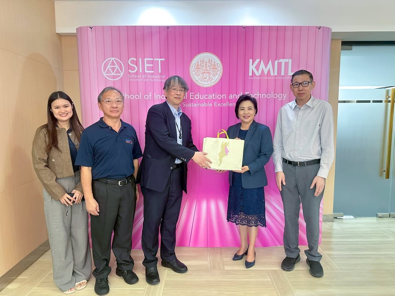 Professor Dr. Pariyaporn Tungkunanan, Dean of the School of Industrial Education and Technology, King Mongkut’s Institute of Technology Ladkrabang (KMITL), together with Associate Professor Dr. Sunti Tuntrakool, Head of Collaborative Development and International Studies Center, warmly welcomed Prof. Dr. Hideaki Aburatani from the National Institute of Technology, Kitakyushu College, Japan, on the occasion of his visit to the School.