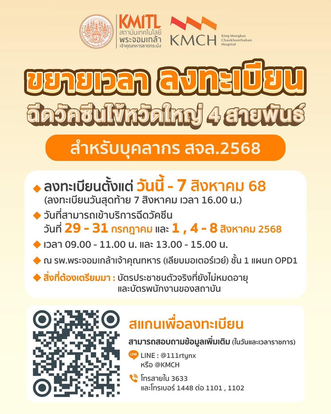 โรงพยาบาลพระจอมเกล้าเจ้าคุณทหาร (KMCH) เปิดให้บริการฉีดวัคซีนไข้หวัดใหญ่ประจำปี 2568