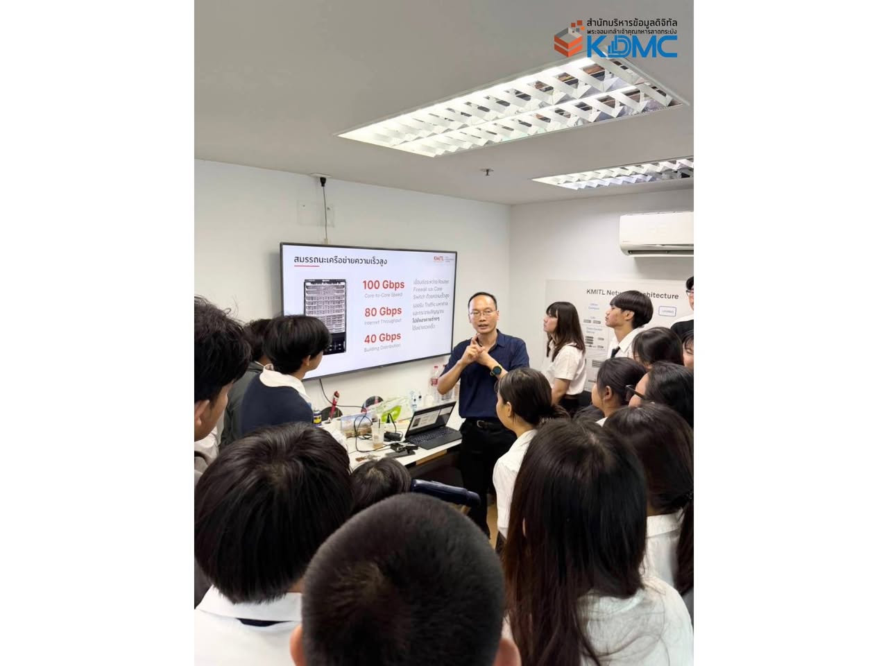 ผู้ช่วยผู้อำนวยการ สำนักบริหารข้อมูลดิจิทัลพระจอมเกล้าเจ้าคุณทหารลาดกระบัง (KDMC) ให้การต้อนรับ พร้อมบรรยายและให้ข้อมูลเกี่ยวกับระบบเครือข่ายของสถาบัน ตลอดจนการบริหารจัดการระบบโครงสร้างพื้นฐานด้านเทคโนโลยีสารสนเทศ