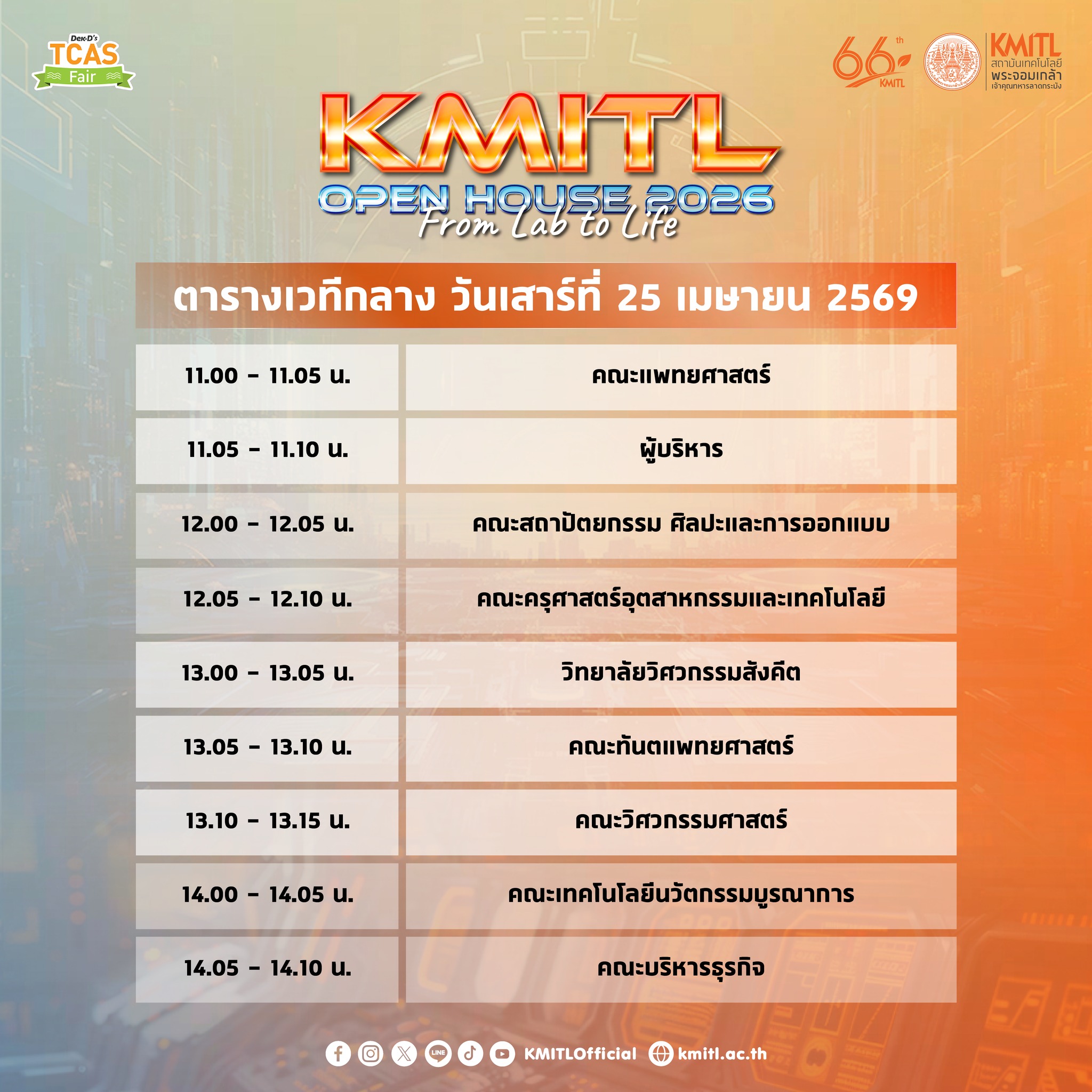 ร่วมฟังทริคจากรุ่นพี่ อาจารย์จาก สจล. ที่เวทีกลาง #KMITLOpenHouse2026 ในงาน Dek-D TCAS's Fair “From Lab to Life" สำหรับเตรียมตัวเลือกคณะที่ใช่