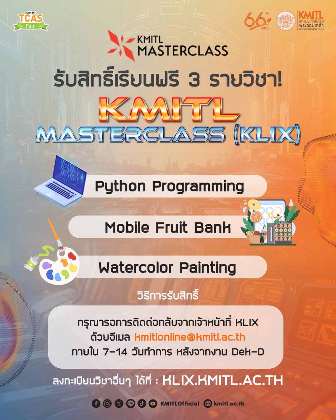 เปิดบ้าน KMITL Open House 2026 ในงาน #DekDTCASFair เพียงลงทะเบียนสะสม e-stamps ก็รับสิทธิ์เรียน #KMITLMasterClass 3 คอร์ส ฟรี![]()