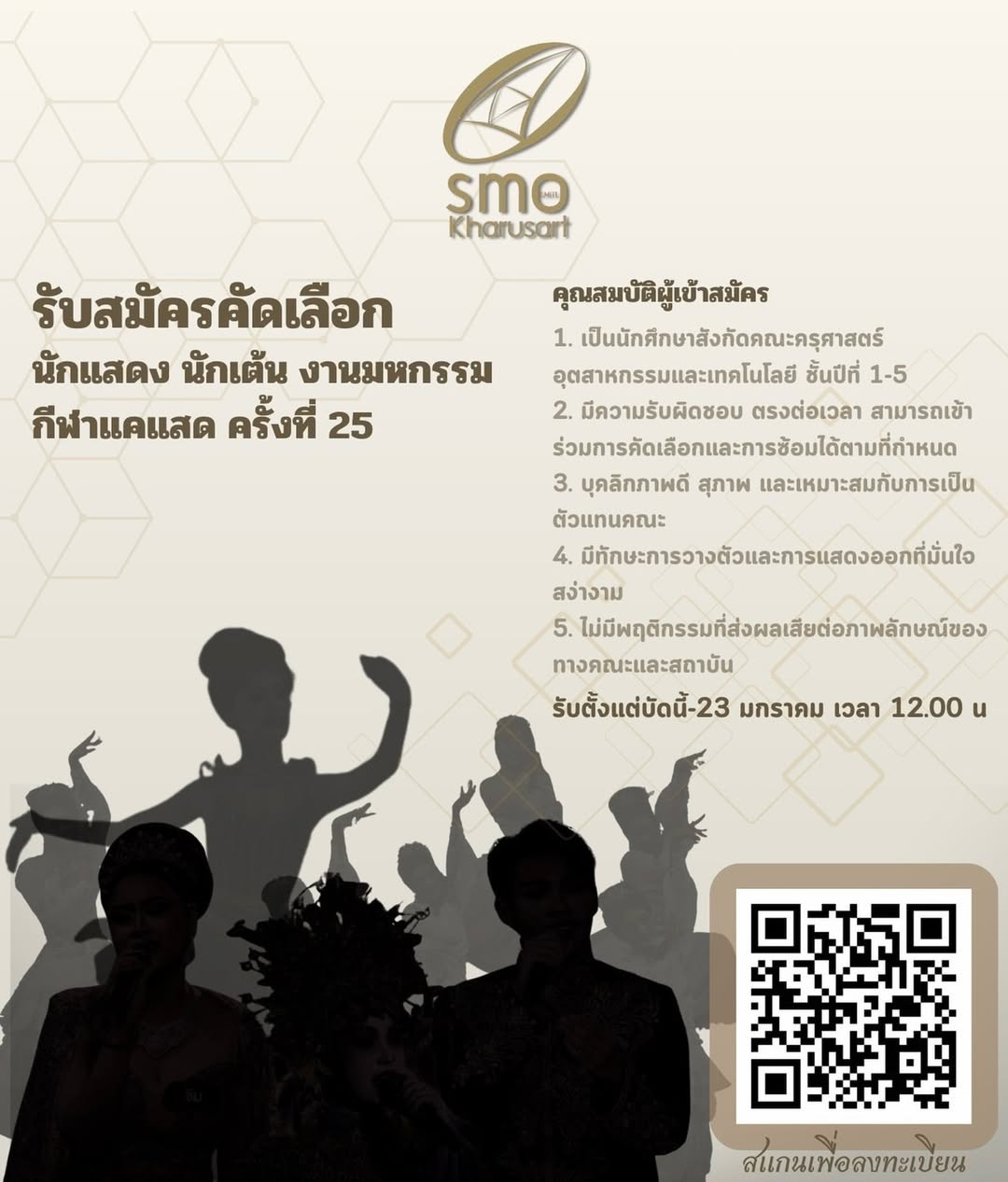 - มีความรับผิดชอบ ตรงต่อเวลา และสามารถเข้าร่วมการคัดเลือก/ซ้อมตามกำหนดได้