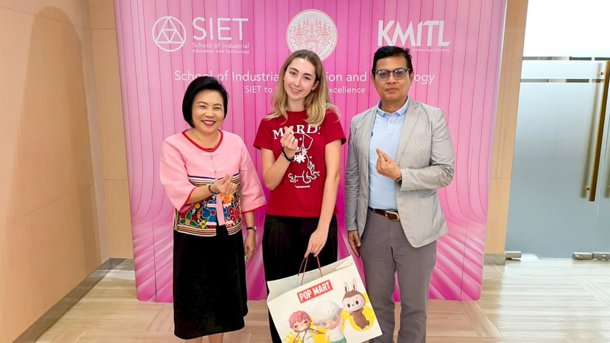On September 25, 2025, Prof. Dr. Pariyaporn Tungkunanan, Dean of the School of Industrial Education and Technology, KMITL, together with Asst. Prof. Dr. Somchai Seviset, lecturer of the Department of Architecture and Design Education and internship advisor, extended their congratulations and presented a token of appreciation to Ms. Bianca Andreea Stefan on the occasion of her departure to Romania, following the successful completion of her internship under the IAESTE Thailand 2025 Program.