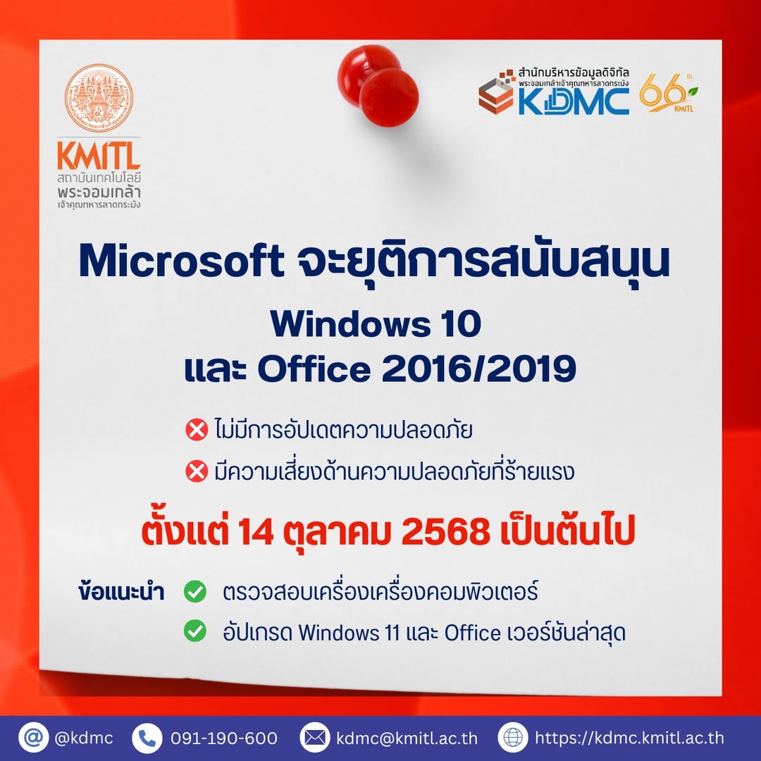 Microsoft จะยุติการสนับสนุน Windows 10 และ Office 2016/2019 ตั้งแต่ 14 ตุลาคม 2568 เป็นต้นไป เพื่อความปลอดภัยของข้อมูล