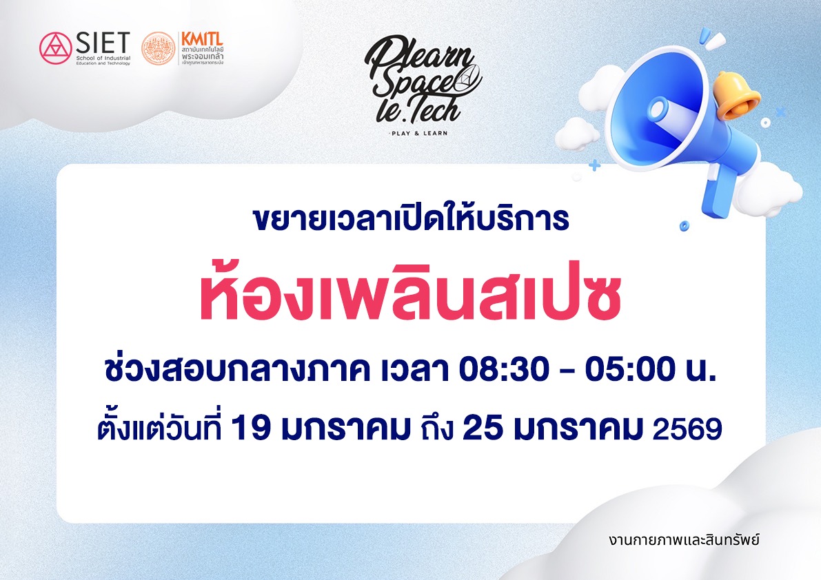 ขยายเวลาเปิดให้บริการ PLEARN SPACE สำหรับช่วงสอบกลางภาคแล้ว ตั้งแต่วันที่ 19 มกราคม ถึง 25 มกราคม 2569