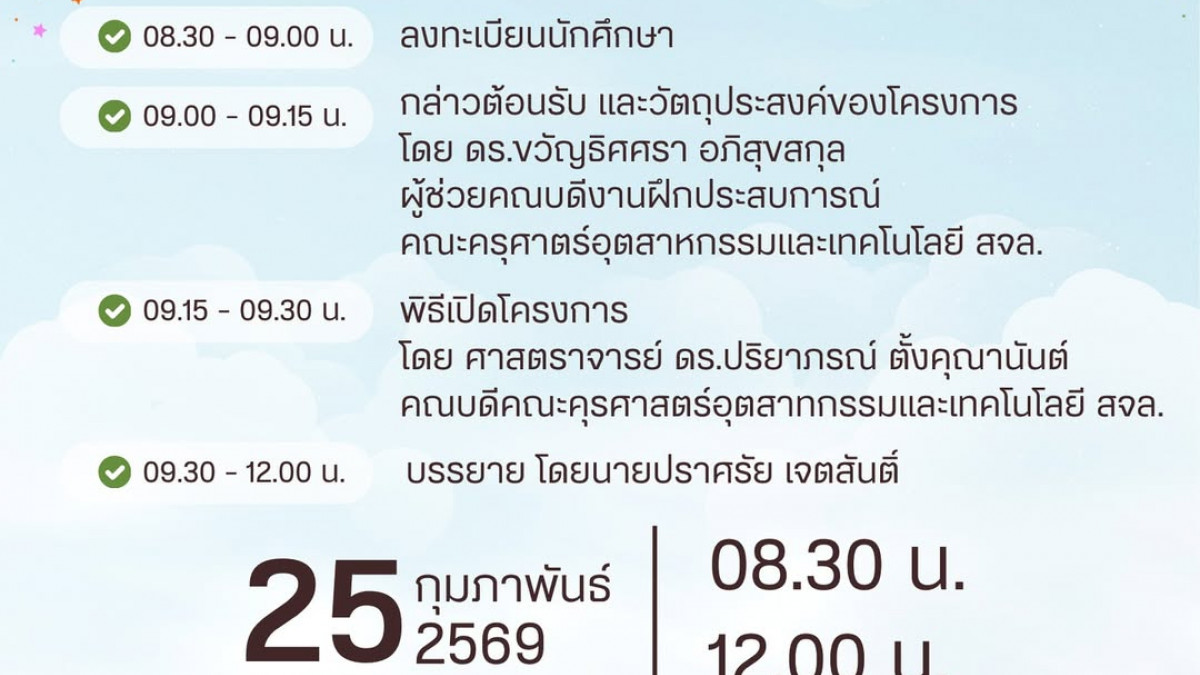 คณะครุศาสตร์อุตสาหกรรมและเทคโนโลยี ขอเชิญชวนนักศึกษาเข้าร่วมโครงการเสริมสร้างความเป็นครู ในหัวข้อ "สร้างครูมืออาชีพ ด้วยจรรยาบรรณและจิตสำนึกวิชาชีพ" เพื่อเป็นการปลูกฝังทัศนคติที่ดี เตรียมความพร้อมด้านจรรยาบรรณวิชาชีพ และเสริมสร้างจิตสำนึกความเป็นครูให้กับนักศึกษา ![]()